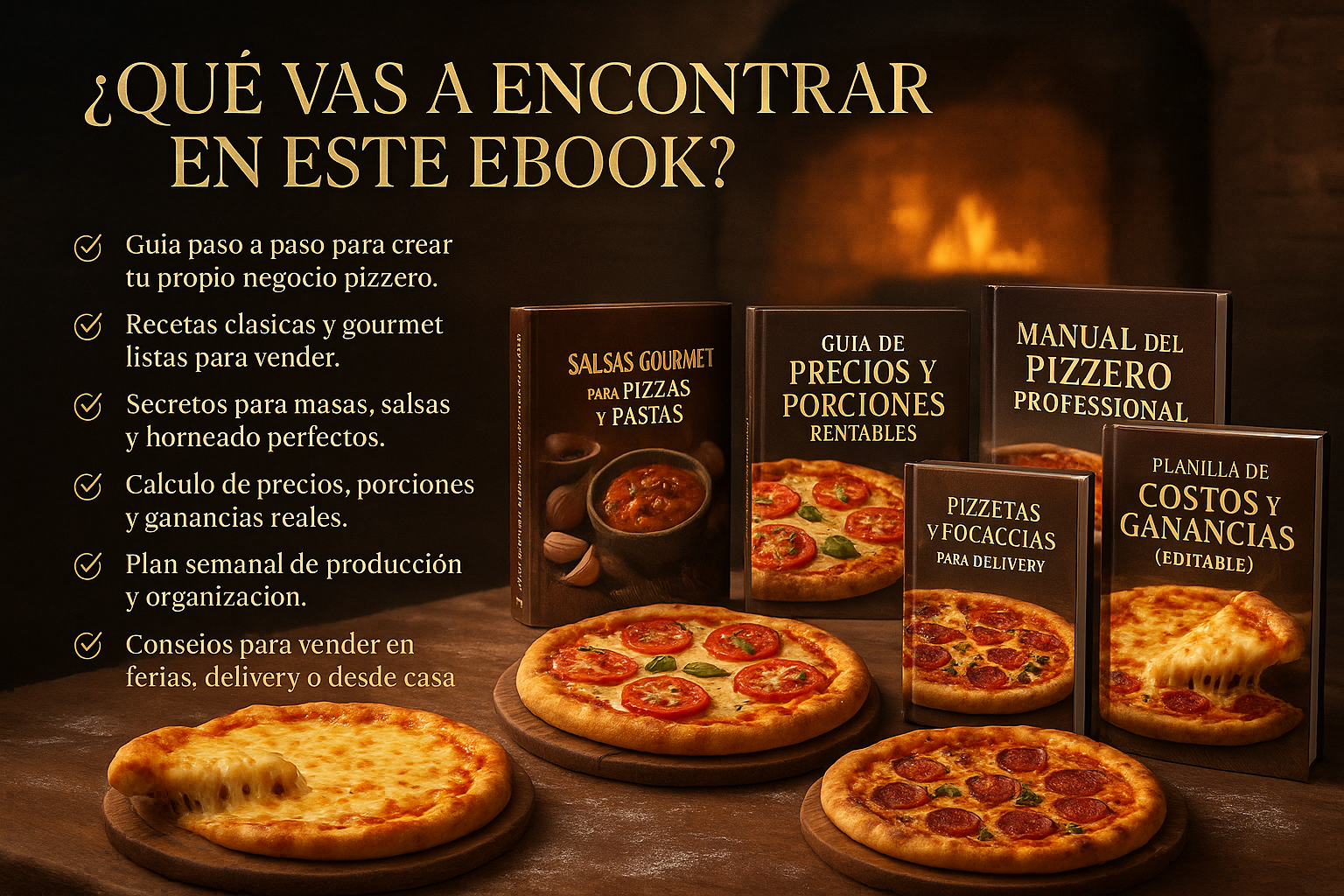 Es una guía paso a paso para crear tu propio negocio pizzero desde casa, con recetas, métodos de masa y estrategias para ganar dinero vendiendo pizzas.